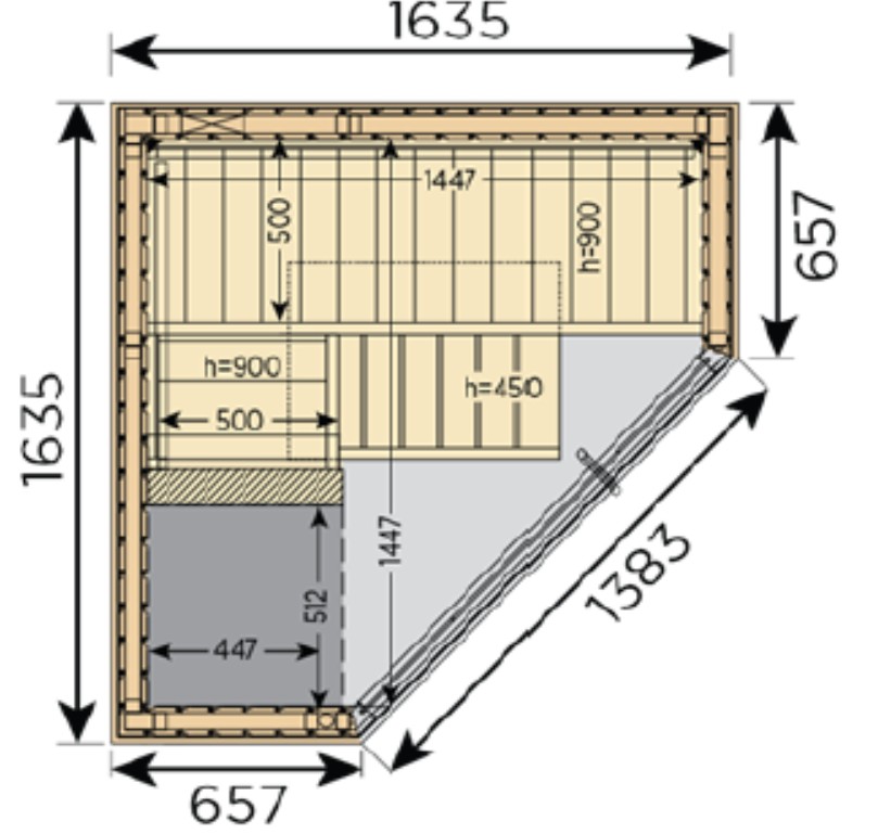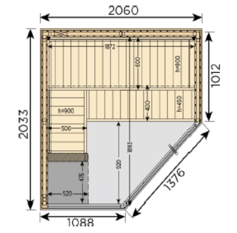 S2020-CV Variant View Corner Large ขนาด 2060 x 2033 x 2016 สำหรับ 1-5 ที่นั่ง แนะนำใช้คุ่กับเตาซาวน่า ขนาด 8-9KW
