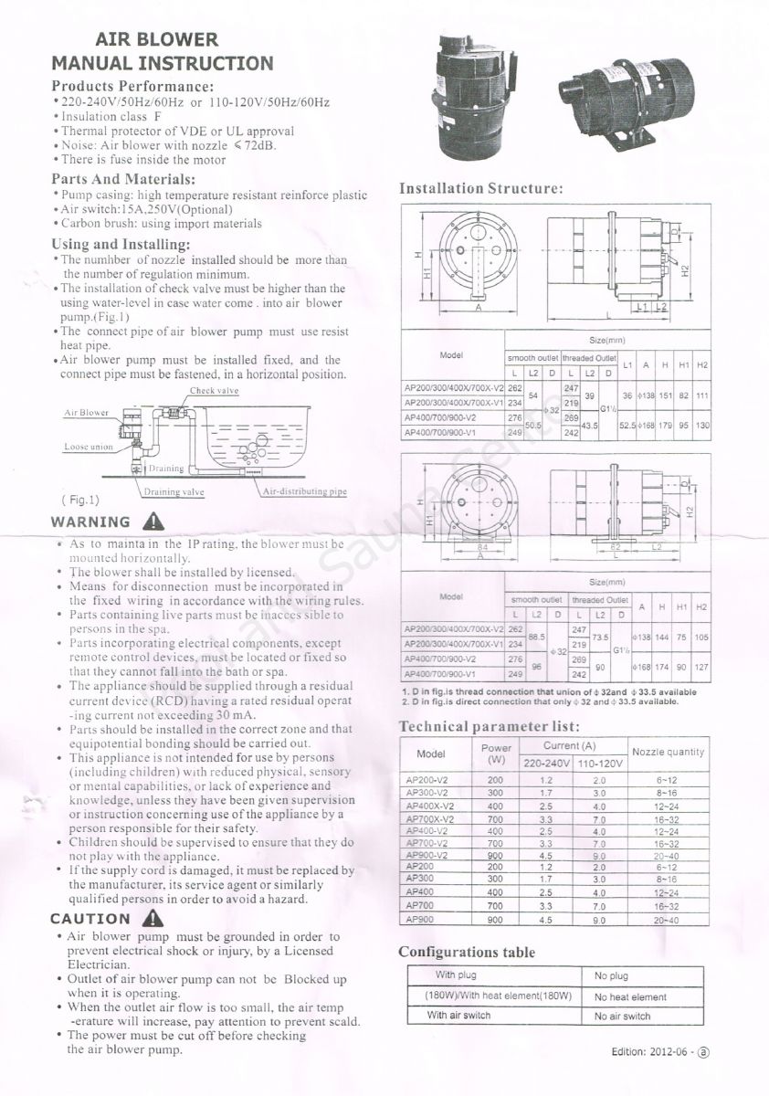 LX Air Blower, SPA Hot Tub Air Blower: AP series SPA Hot Tub Air Blower are first recommended products with low noise, long life, easy installation and competitive price. They are company's most mature products and have been accepted by users. The casing is high reinforce and high temperature resistant engineering plastic. There are two types of structure: Single impeller structure and double impeller structure. The lives of double impeller air blowers are longer than the single impeller ones. The differences of air pressure and air flow between single impeller ones and double impeller ones are inconspicuous. Compare the data of noise, although the dB(A) value of double impeller air blower is only 2 or 3 points lower than single impeller air blower, the high-frequency noise of double impeller air blower is much lower than single impeller air blower in peoples' hearing. The wind of double impeller air blower is soft and comfortable. They are the first choice products for hydro massage bathtub and SPA large pool which making bubble.