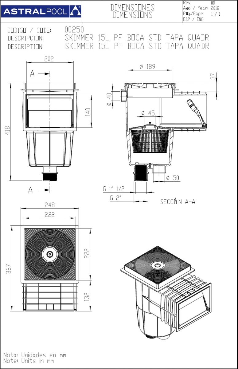 สกิมเมอร์สำหรับสระว่ายน้ำ ยี่ห้อ ASTRAL รุ่น 00250 ขนาด 15 ลิตร
