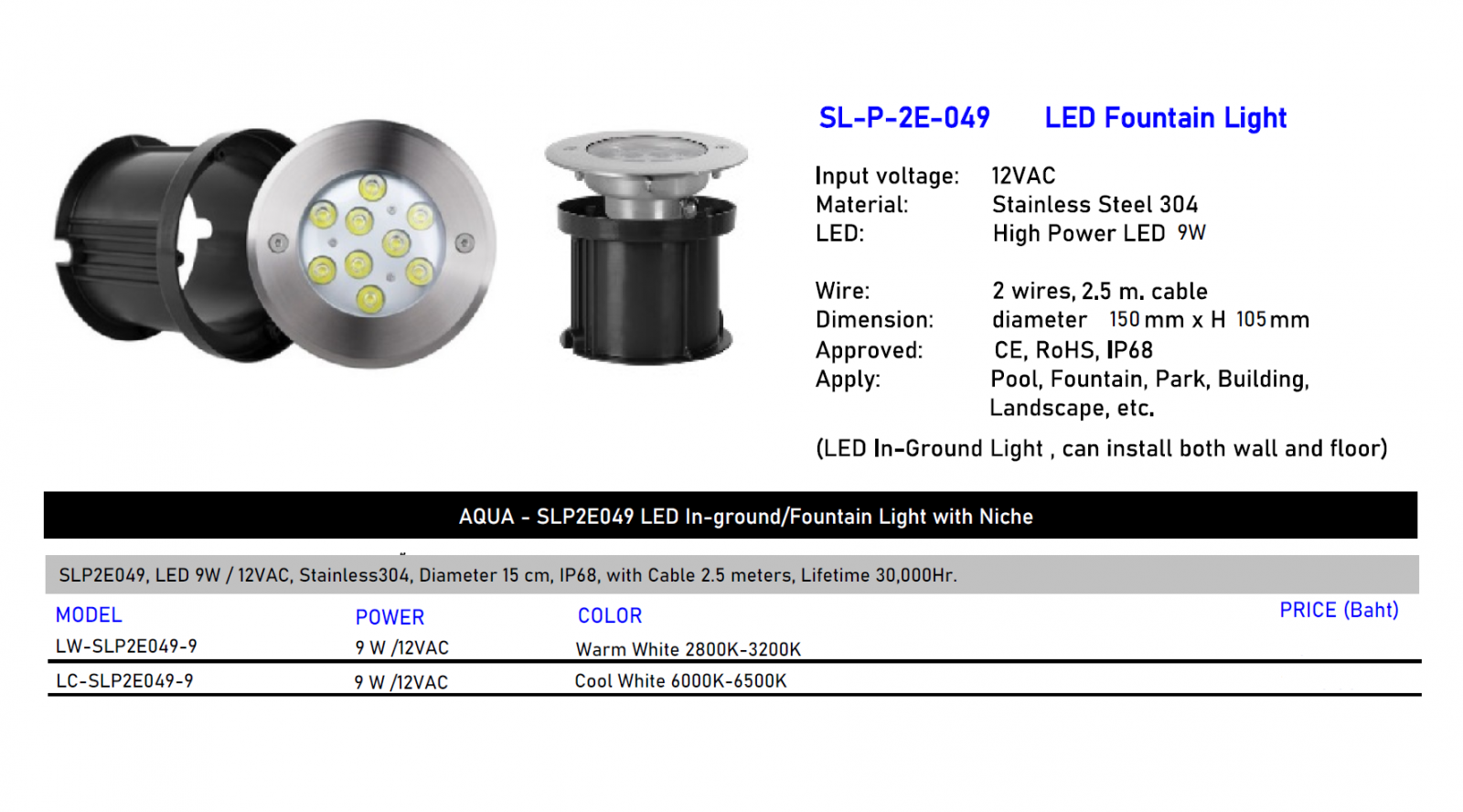 ไฟใต้น้ำ mini LED แบบฝัง ยี่ห้อ AQUA รุ่น SL-P-3A-049